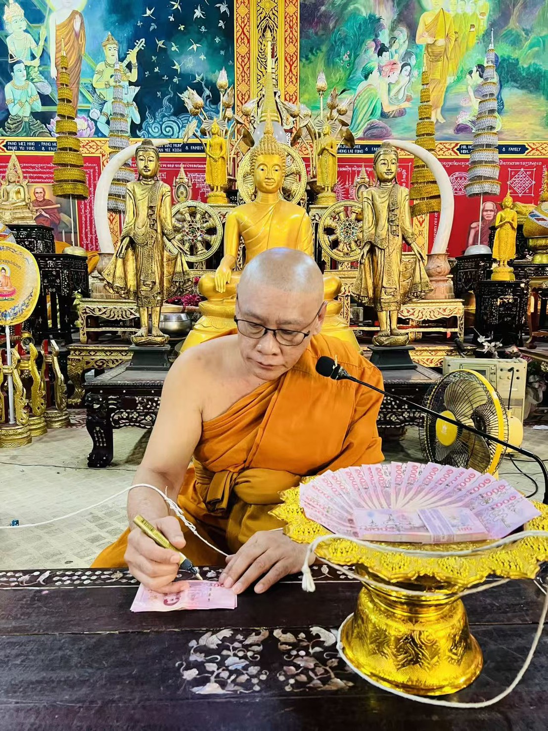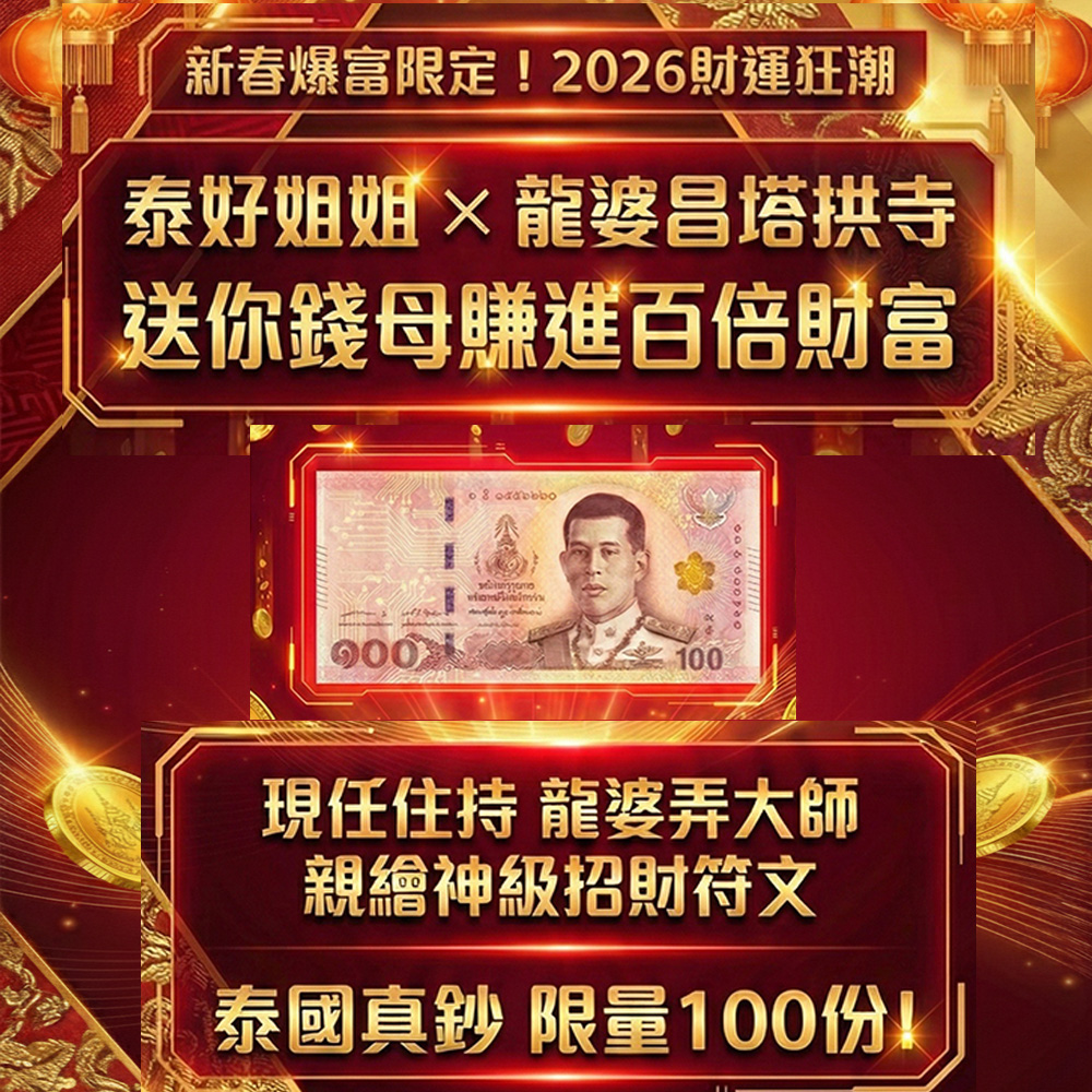 這不是印好的符、也不是套版大量製作,而是由泰國皇家寺廟塔拱寺龍婆弄大師親手在每一張泰國 100 泰銖真鈔上「一筆一畫」手繪符文入法。